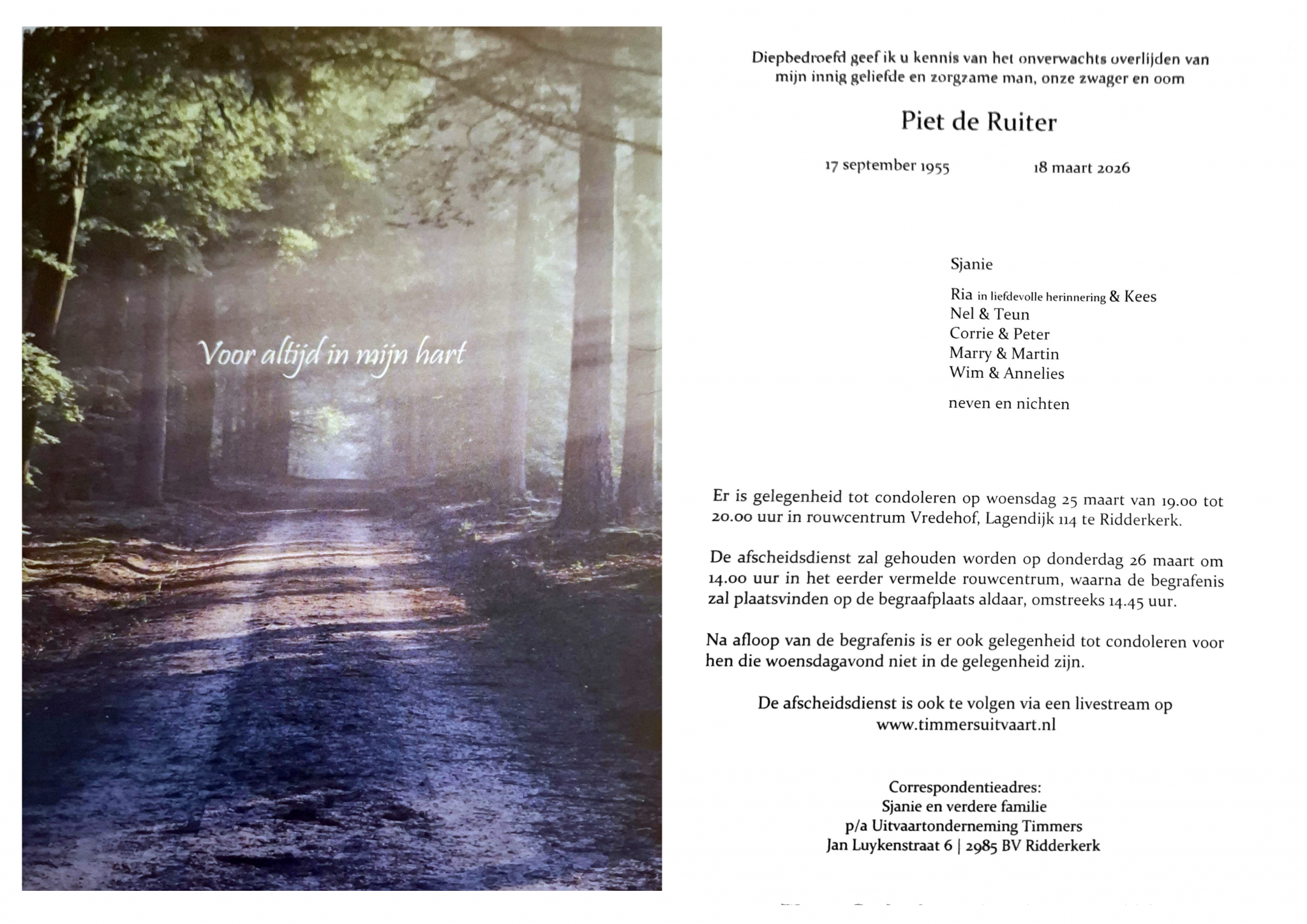 Heden ontvingen wij een bericht van overlijden van oud RVVH-lid Piet de Ruiter. We wensen echtgenote Sjanie, overige familie, vrienden en kennissen heel veel sterkte toe bij de verwerking van dit enorme verlies.